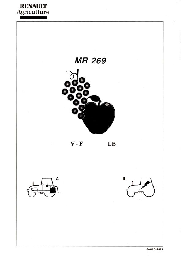 Réf:/Renau MR 269 VF LB Manuel de réparation Renault - MR 269 de mars 1996 - . Ce manuel traite la partie hydraulique des tracteurs versions VF et LB. On y propose également tous les schémas de circuits électriques pour les tracteurs des versions précitée, ainsi que le pont avant A 20 11. Manuel en 3 chapitres, 127 pages au total. En français